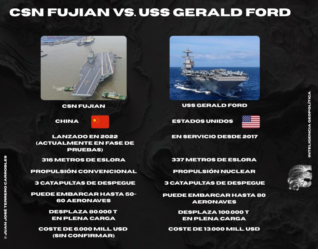 El Fujian tiene una propulsión convencional (a partir de diésel o queroseno marino), lo que le resta autonomía y potencia. Esto se observa en su capacidad para apenas desplazar 80 mil toneladas frente a las casi 100 mil que constituyen el Gerald Ford. Sin embargo, China inició en octubre de 2025 la construcción de un cuarto portaaviones que ya cuenta con propulsión nuclear, lo cual fortalecerá aún más el alcance de la presencia global de la armada china; a pesar de que se desconoce cuando este buque va a entrar en servicio.